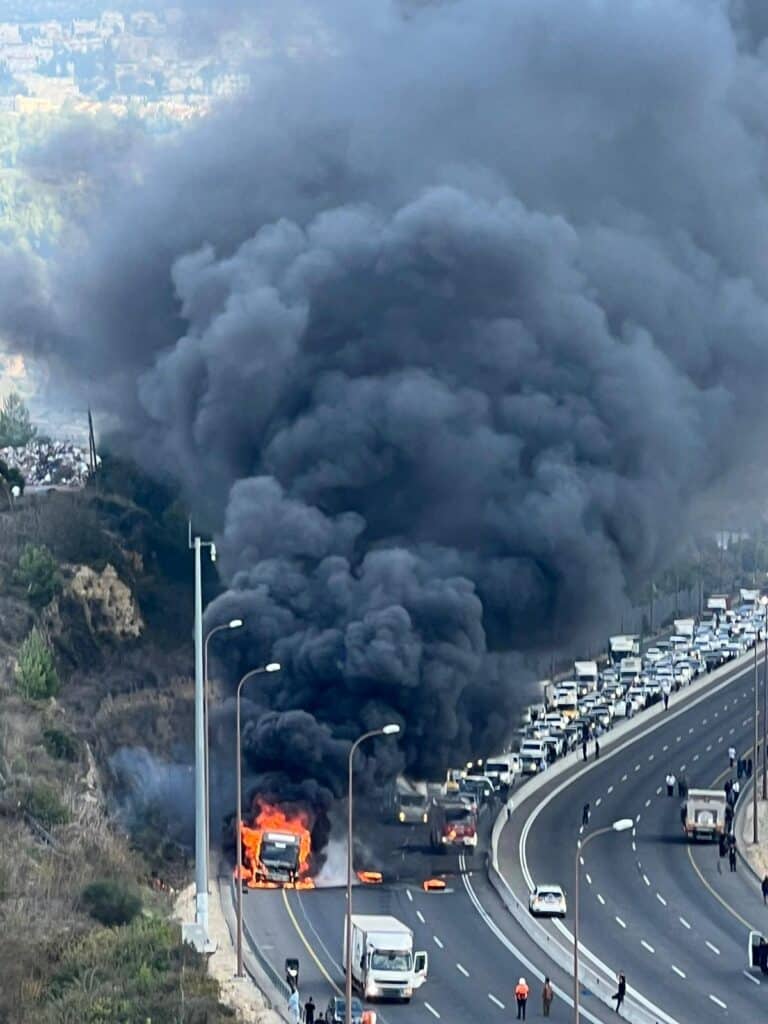 כביש 1: משאית עלתה באש וגרמה לעומסי תנועה כבדים