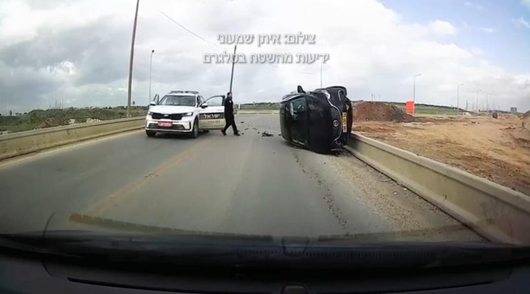 המשטרה עצרה סמוך למעבר אייל שני פלסטינים בשנות ה-20 לחייהם, שחשודים בגניבת רכב • הם נסעו במכונית במהירות מופרזת, ביצעו תאונה עצמאית - והתהפכו בצד הדרך • צפו