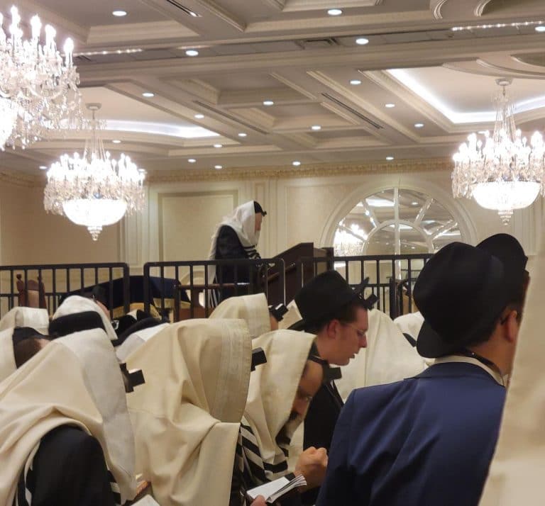 תיעוד נדיר: כ"ק האדמו"ר מגור בתפילת שחרית של ראש חודש במונסי, באולם מיוחד שהפך לבית המדרש לזמן שהותו שם לרגל נישואי נכדתו