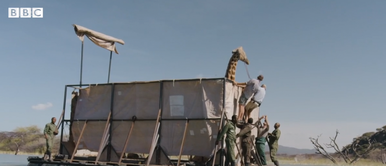 בגלל מזג אויר חריג האי נותק מהיבשה והג'ירפים נותרו על האי ללא חיבור ליבשה. המקומיים בנו להם רפסודות מיוחדות בכדי שיוכלו להשיט אותם מהאי אל היבשה בכדי לגשת אל החיות ירו בהם המחלצים חצי הרדמה וכשהן התעוררו כבר היו עם חבלים שכיוונו אותם לעלות על הרפסודות