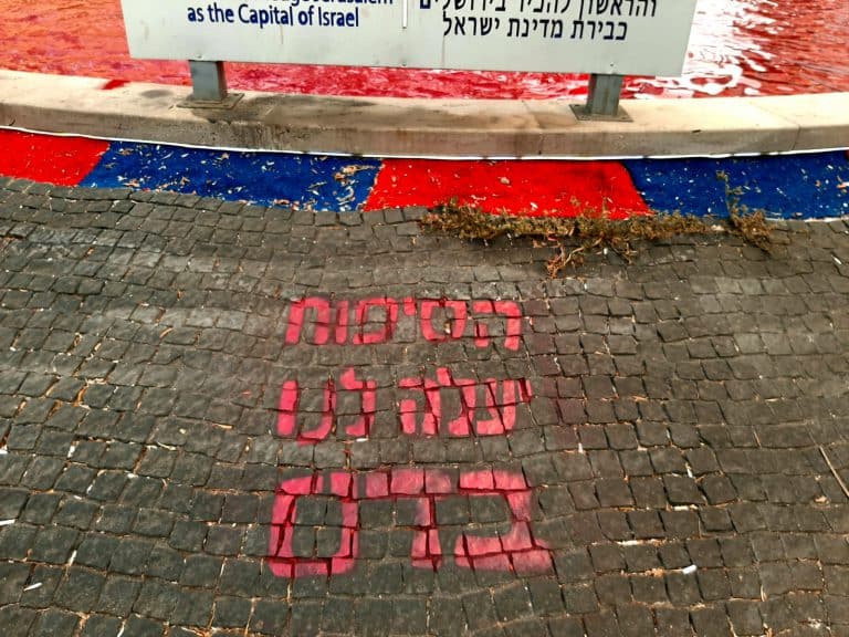 "סיפוח יעלה לנו בדם" כך כתבו פעילי ימין על כיכר טראמפ בפתח תקוה ומילאו את מזרקת המים בצבע דם - צפו