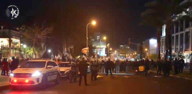המשטרה עצרה 4 מפגינים נגד הממשלה בחשד להפרת הסדר הציבורי וחסימת התנועה ועצור נוסף בחשד לתקיפת שוטרים ברחוב קפלן, סמוך למתחם שרונה בתל אביב • השוטרים רשמו דוחות תנועה נגד 6 מפגינים נוספים, בגין הפרעה לתנועה ועשיית מעשה שלא כדין