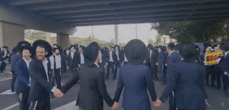 כמחאה על מעצרו של תלמיד הישיבה עצרו עשרות בחור הפלג הירושלמי הקיצוני את כביש גהה והחלו פורצים בשירת "שערי שמיים פתח" • הצלם דוד קשת תיעד