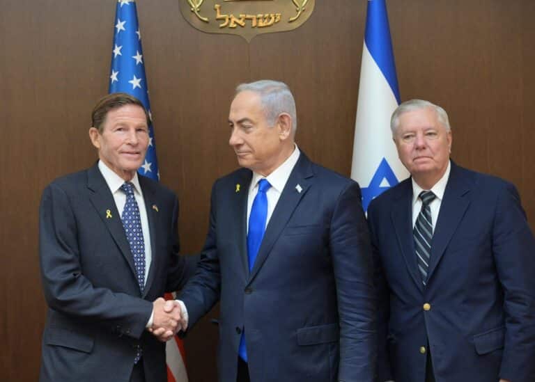 הסנאטור ריצ׳רד בלומנטל: ״תודה ראש הממשלה. יש לנו הכבוד להיות איתך, ואנחנו מעריכים שנתת לנו את ההזדמנות לדבר איתך ביום כל כך קשה ומייסר למדינה שלך ולעם ישראל."