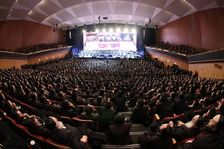 אלפי אברכי חסידות גור מכל הארץ שזכו לידיעת התורה נבחנו בעל פה על כל הש"ס במבחן פומבי בבניני האומה כשחברי מועצגה"ת מרנן הגרב"מ אזרחי והגר"י זילברשטיין בוחנים אותם