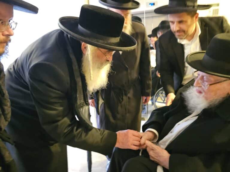 מרן ראש הישיבה הגרמ"צ ברגמן נפגש הבוקר עם כ"ק האדמו"ר מדושינסקיא וחשף בפני פרט מרתק מתקופת ילדותו בירושלים; האדמו"ר בירך לעומתו "לקיים בנו חכמי ישראל" • צפו בתיעוד