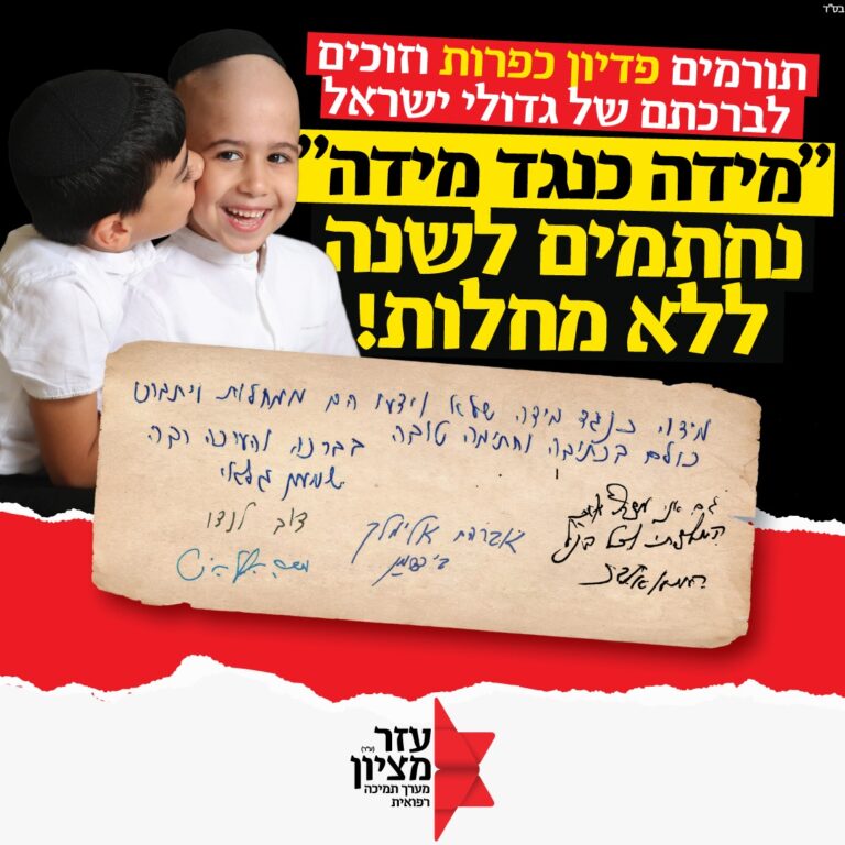 ב'עזר מציון' פותחים את שנת תשפ"ד עם כ־4,000 חולי סרטן ובהם ילדים רבים שזקוקים לליווי, תמיכה וסיוע. השנה נותנים את פדיון הכפרות לעזר מציון. גדולי ישראל יתפללו בעד התורמים שהם לא ידעו ממחלות בשנה החדשה שזה עתה התחילה "ישלח דברו וירפאם". פדיון כפרות גרסת 2023. נכון לתשרי תשפ"ד ממלאים את המחלקות האונקולוגיות קרוב לארבעת אלפים ... להמשך קריאה