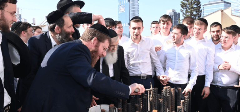 ראש הישיבה ששמח מאוד לראות את התקדמות הבנייה, עלה בעצמו יחד עם קבוצת בחורים אל אתר הבניה ופצח איתם יחד בשירת 'ויהי נועם' ושירי תודה לקב"ה | צפו
