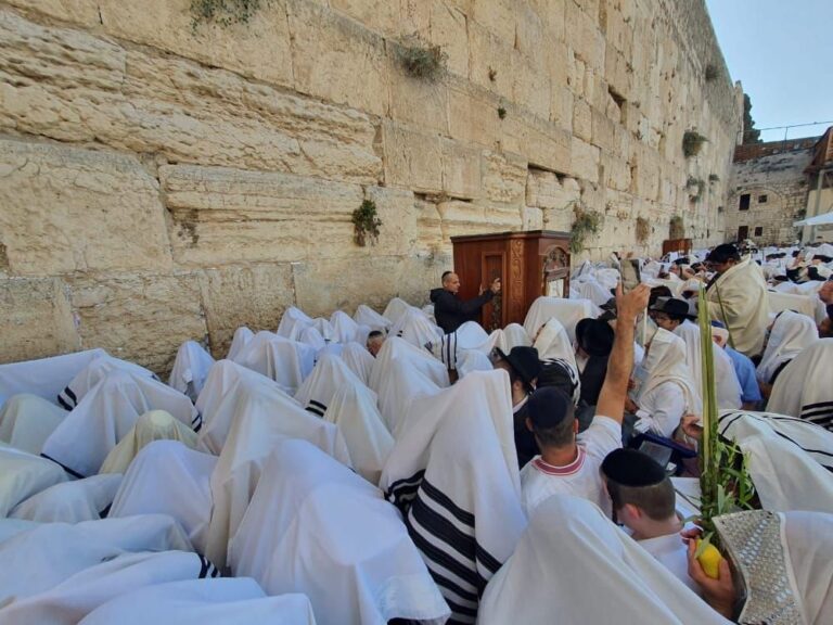 המוני עמך בית ישראל מכל העדות והחוגים נהרו הבוקר אוחזי בידם ארבעה מינים לעבר הכותל המערבי דרך סמטאות העיר העתיקה לתפילת שחרית מול שריד בית מקדשינו | צילום: א. אייזנבאך