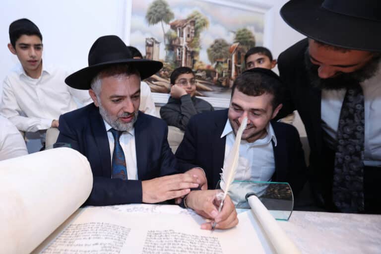 מעמד חתימת שטרות שותפות לתורמי 'קופת הקהל' דחסידי מכנובקא בעלזא