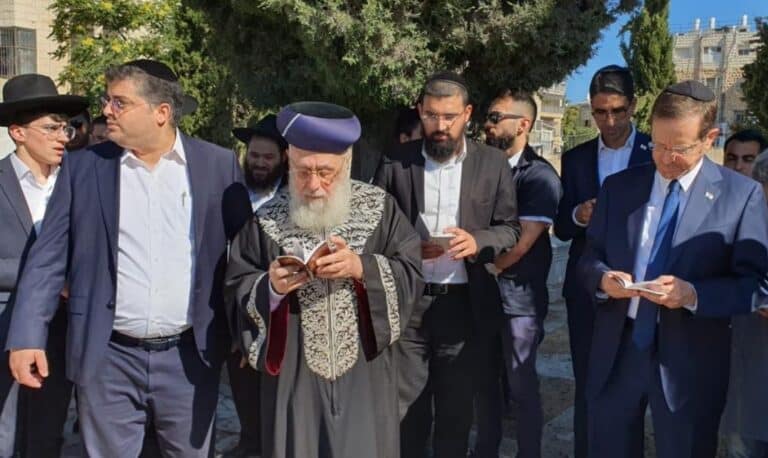 הגר״י יוסף הגר"י אפרתי והגר"ד לאו הגיעו היום להשתתף ביארצייט לרב הראשי וראש הרבנים לארץ ישראל הראשון הגאון רבי יצחק אייזיק הלוי הרצוג זצ״ל יחד עם נכדו נשיא המדינה יצחק הרצוג