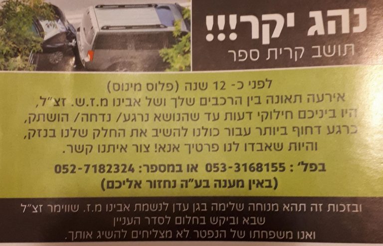 האבא בא בחלום לבני ביתו וביקש לסדר את התשלום הכספי שנגרם בשל תאונה, כעת מנסים בני המשפחה לאתר את הנהג ממודיעין עילית באמצעות מודעות בעיתונות המקומית
