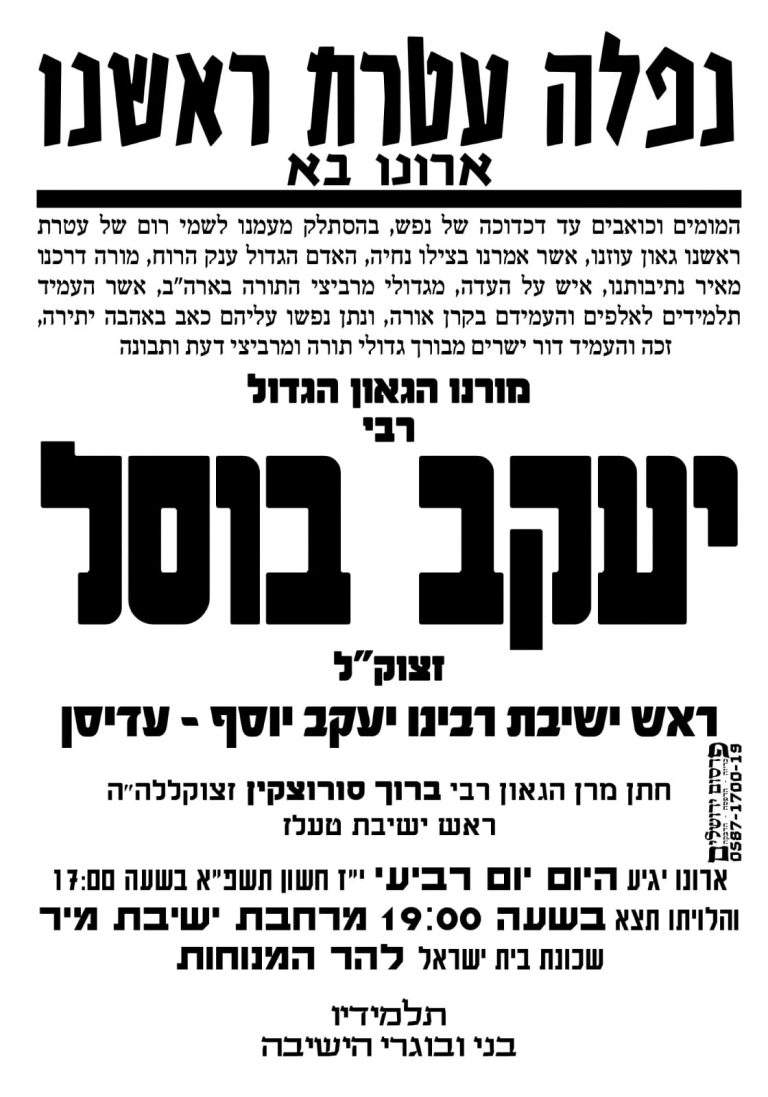 הלווית ראש ישיבת רבינו יעקב יוסף הגר"י בוסל זצ"ל, חתנו של הגר"ב סורוצקין זצ"ל ר"י טעלז, ארונו בא ארצה; ההלוויה מרחבת ישיבת מיר • שידור חי