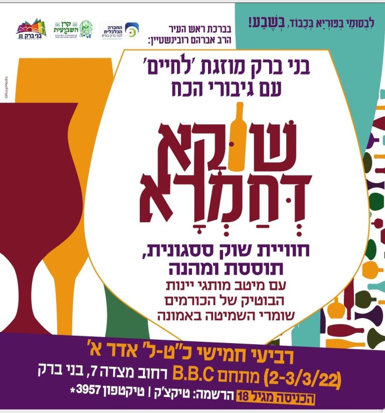 החברה הכלכלית לבני ברק בשיתוף 'קרן השביעית' יקיימו יריד יין ייחודי ליקבי בוטיק מכל רחבי הארץ השומרים את שנת שמיטה. הרב אברהם רובנשטיין, ראש עיריית בני ברק: "חודש אדר זאת הזדמנות אדירה לתמוך בכורמים גיבורי החיל שומרי השמיטה, ולשלב זאת בתמיכה והעצמה של מתחם העסקים התוסס בצפון העיר"