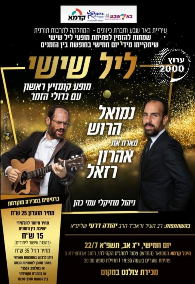 עיריית באר שבע עורכת הערב קומזיץ מיוחד בשיתוף כיוונים וערוץ 2000 עם אהרן רזאל ונמואל הרוש, צפו בשידור החי