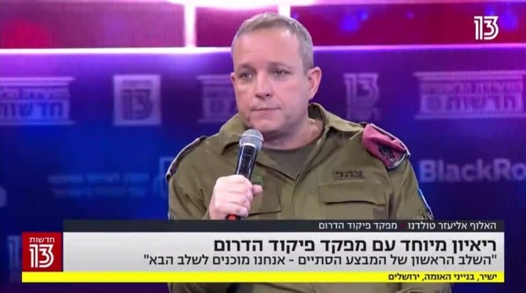 מפקד פיקוד הדרום, האלוף אליעזר טולדנו, שוחח היום (חמישי) עם אלון בן דוד במסגרת הוועידה הלאומית של חדשות 13. לדברי טולדנו, "השלב הראשון של מבצע שומר החומות הסתיים, אנחנו מוכנים לשלב הבא כי מה שעשינו לא מספיק. המבצע יסתיים לחלוטין כאשר המציאות הביטחונית תשתנה באמת. אנחנו צריכים למצות את המבצע שכבר התחלנו".