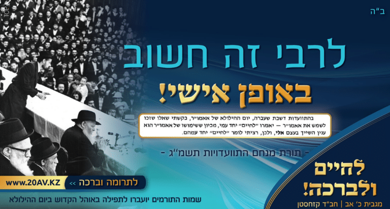 הערב - כ' מנחם אב הוא הוא יום ההילולא של רבי לוי יצחק שניאורסאהן, אביו של הרבי. זוהי ההזדמנות לחסידים לתת לרבי משהו שהיה חשוב לו באופן אישי. ברכה מיוחדת: 500 פעמים ככה! • יהדות