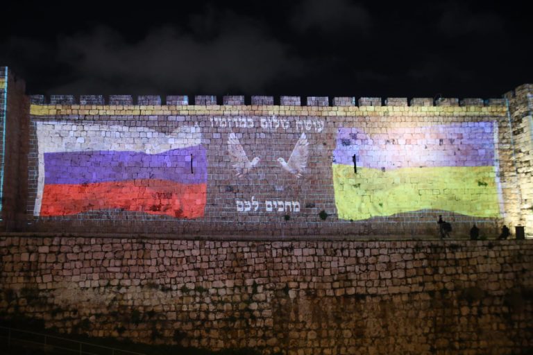 עיריית ירושלים האירה הערב את חומות העיר העתיקה בדגלי רוסיה ואוקראינה לצד המשפט "מחכים לכם" מעיריית ירושלים נמסר: "ירושלים, בירת מדינת ישראל, היא עיר של שלום ודו קיום. אנו בעד הפסקת הלחימה והגעה להבנות בין הצדדים. נשמח להענות לפנייתו של נשיא אוקראינה, ולדימיר זלנסקי, ולארח את הדיאלוג הדיפלומטי בין שתי המדינות כאן בירושלים."