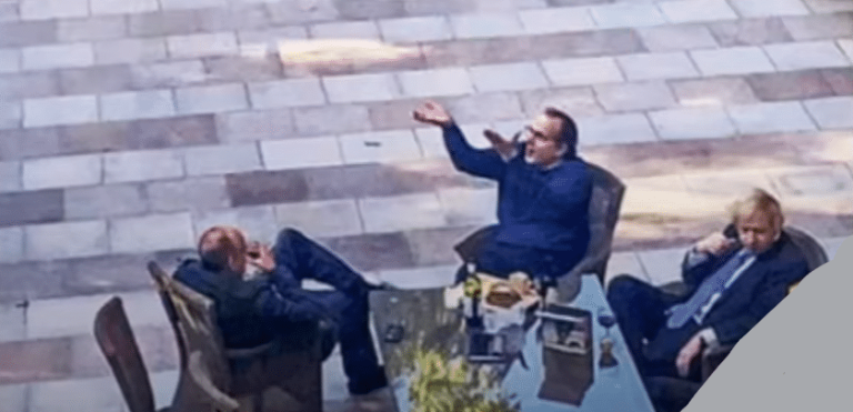 ראש ממשלת בריטניה, בוריס ג׳ונסון, תועד מסב לשולחן עם יין וגבינה בחצר בדאונינג 10 במהלך הסגר הראשון במאי 2020. בתמונה שפורסמה אתמול בגרדיאן נראים בסביבתו של ג׳ונסון 17 אנשי צוות וכן רעייתו. התמונה הועברה לידי העיתון לאחר בלשכת רה"מ הכחישו בשבוע שעבר כי התקיים אירוע חברתי באותו יום שישי של 15 במאי 2020