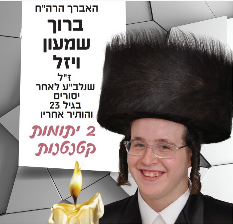 לפני פחות משבועיים הלך לבית עולמו בדמי חייו האברך הצעיר הרב ברוך שמעון ויזל ז''ל, בן עשרים ושלוש בלבד היה, אך יסוריו הקשים הכריעו אותו. הוא הותיר אחריו את רעייתו האלמנה שתחי' ושני ילדות קטנות שלא יזכו לראות את אבא יותר. כעת, הם חייבים את העזרה שלנו, וזהו ההזדמנות שלנו להאיר את הבית החשוך והאבל