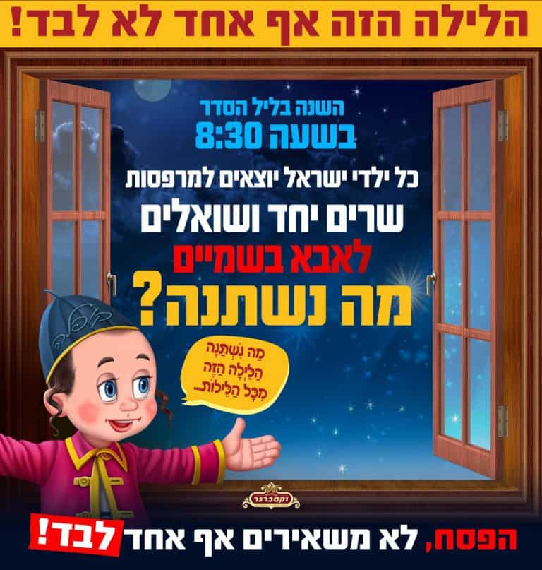 יוזמה שצברה תאוצה ביממה האחרונה לקראת ליל הסדר, קוראת להוציא את כל הילדים למרפסות הבתים בשעה 20:30 ולשיר 'מה נשתנה', זאת לטובת הזקנים והמבודדים שיוכלו לקחת חלק באווירת החג.