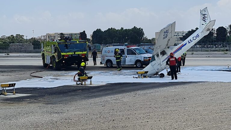 תאונת מטוס קל עם טייס אחד בשדה התעופה בחיפה. המטוס הגיע לנחיתה ירד מהמסלול , כרגע עומד על הכנף הימני , כוחות ההצלה של השדה במקום