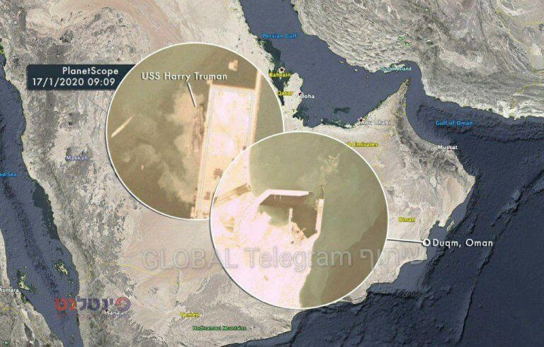 תמונות לוויין אחרונות מראות את נושאת המטוסים הארי טרומן אתמול בפורט דאג, עומאן נמל זה נמצא 5 ק"מ מאירן