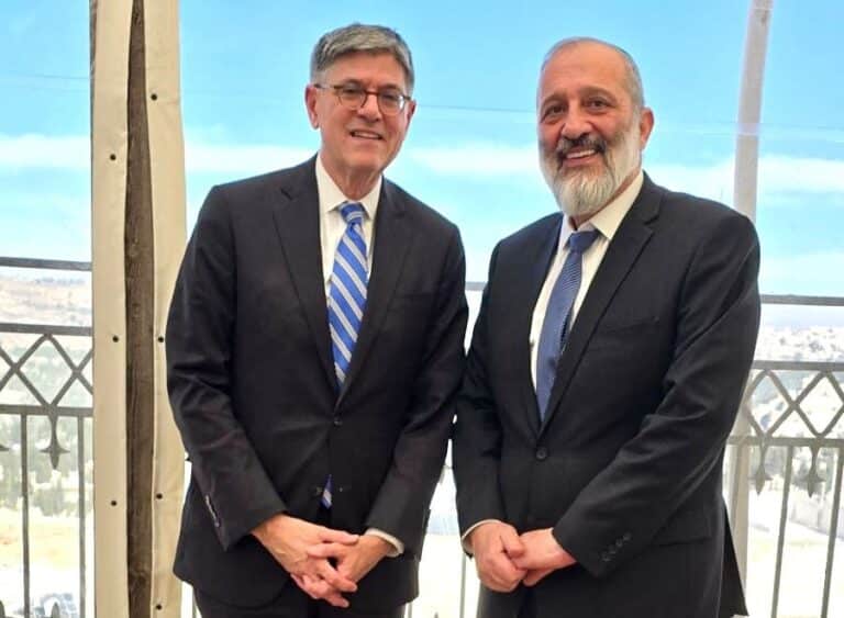 שגריר ארצות הברית בישראל, ג'ק לו, נועד היום בירושלים עם יו"ר ש"ס, אריה דרעי, ודן עמו בין היתר במאמצים להשבת החטופים • השגריר לו, המסיים בקרוב את כהונתו בישראל, כחלק מחילופי הממשל בארה"ב