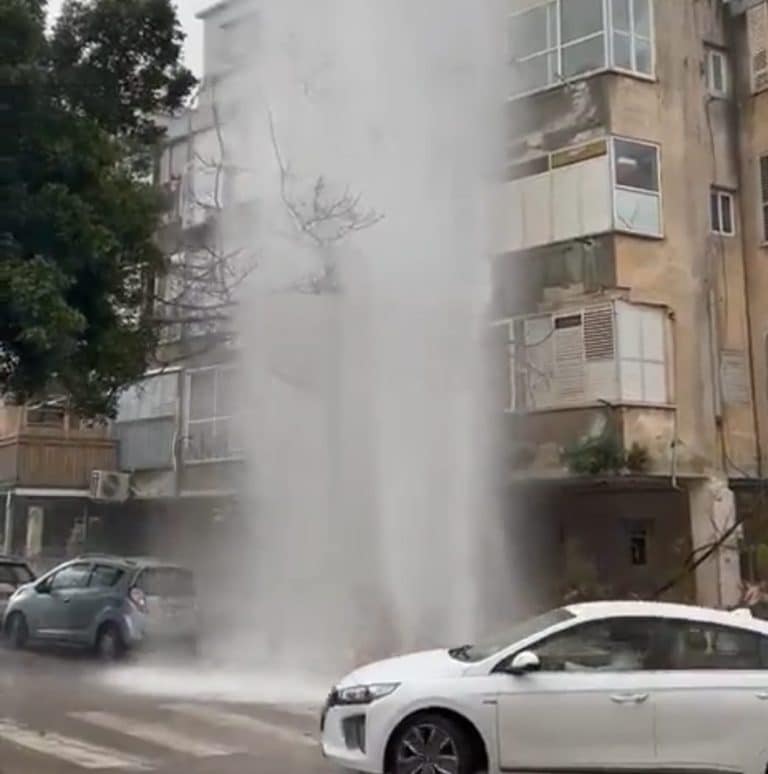 צינור מים התפוצץ ברח׳ נורדאו פינת טרומפלדור בבני ברק, הזרם הגיע עד קומה רביעית, בעירייה פועלים לתיקון הפיצוץ