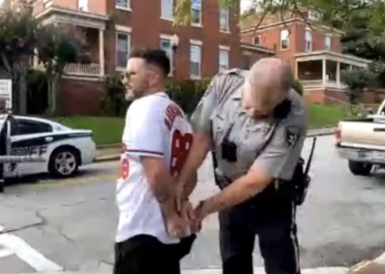 ג'ון מינאדו השני - מנהיג קבוצת העליונות הלבנה 'ליגת ההגנה של גויים' - נעצר אמש לאחר שגרם להפרעה וביצע פרובוקציות מחוץ ל-'בית ישראל' במייקון, ג'ורג'יה • מינאדיאו עומד מאחורי מאות מסעות פרסום המשמיצים יהודים, הכחשת שואה והפצת תיאוריות קונספירציה