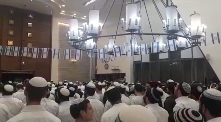בישיבת מרכז הרב רקדו הערב בשירי הודאה לרגל 73 שנה לקום המדינה כשהיכל הישיבה מלא מפה לפה ומקושט בדגלים כפי שנהוג בחוגי הציונות הדתית