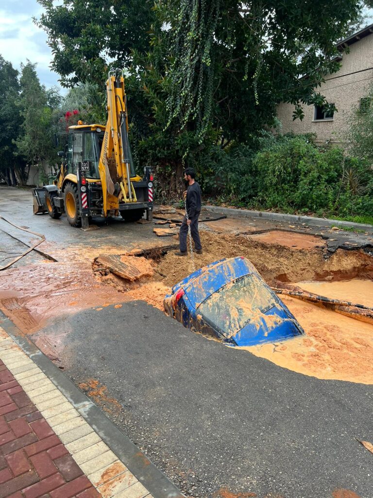 בולען נפער בכביש בהוד השרון ככל הנראה מתקלה בתשתית המים התת קרקעית. צפו בחילוץ הרכב התקוע