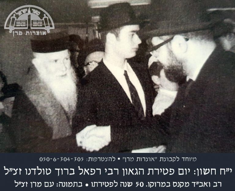במלאת יובל לפטירת הגאון רבי רפאל ברוך טולדנו זצ"ל, רב ואב"ד מקנס – מרוקו, שחל היום – י"ח חשון, אנו מפרסמים תיעוד וידאו מרגש: סיפורו המיוחד של מרן זצ"ל, כאשר פגש לראשונה את הגאון זצ"ל שהופתע שבעל ה'יביע אומר' הוא אברך צעיר..