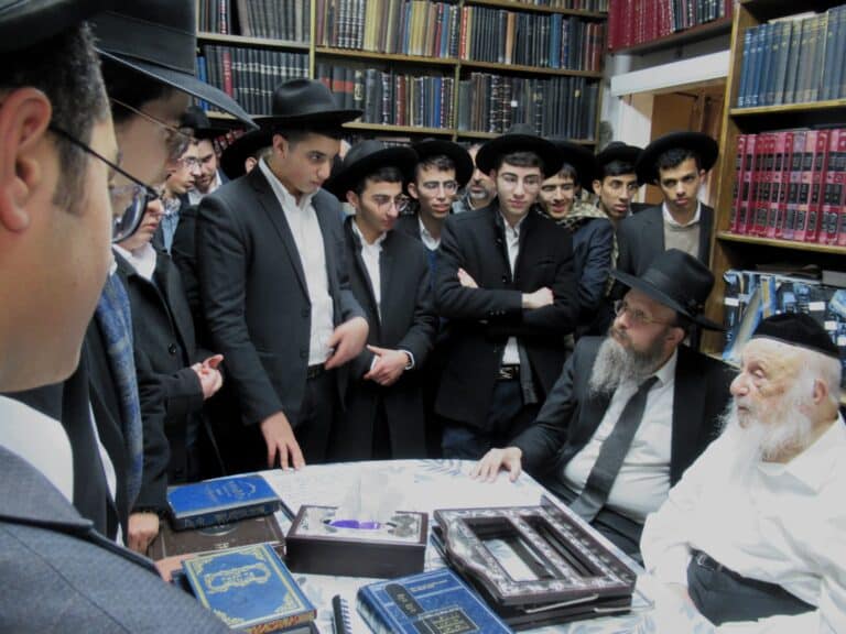 תלמידי שיעור ג' מישיבת 'ארחות יהודה' באלעד התקבלו לביקור חיזוק נדיר במעונו של ראש ישיבת פוניבז'. הגרב"ד פוברסקי בחן את התלמידים והתפלפל עמם בלימוד • הביקור נערך כהוקרה על מאות דפי גמרא ועשרות שעות תענית דיבור שלמדו התלמידים למען הצלחת הישיבה. "השיעורים של תלמידי הרב ניימן מתוקים מאד", שיבח ראש הישיבה.