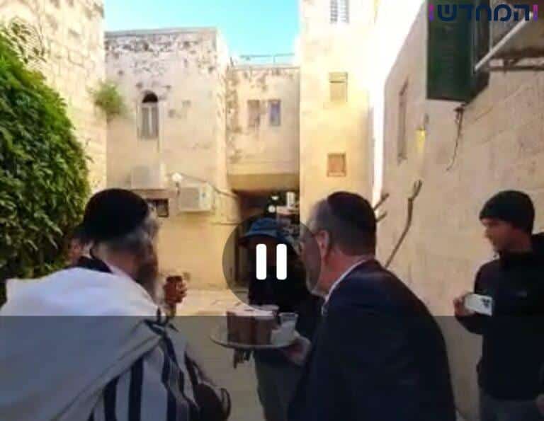 קבוצת מפגינים חיכו מתחת לביתו של יו"ר סיעת יהדות התורה ח"כ יצחק פינדרוס בעיר העתיקה בירושלים בניסיון לייצר פרובוקציה ותלו דגלים ללא רשות על חלונות השכנים • פינדרוס הפתיע אותם עם כוסות קפה וסוכר והזמין אותם להגיע יחד עימו לתפילה • המפגינים מלמלו במבוכה והסתלקו מהאזור • צפו