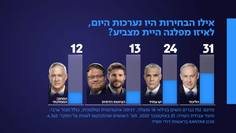 בעוד שמונה ימים ייפתחו הקלפיות בבחירות 2022 ואזרחי ישראל, לפחות חלקם ינסו להשפיע על התוצאות. סקר חדש מגלה כי נתניהו שומר על כוחו בזמן שהציונות הדתית נחשלת וגנץ מתחזק אולם הגוש משיג 60 מנדטים