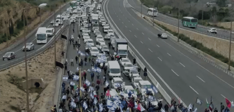 מפגינים חסמו הבוקר את כביש מספר 1 בקריאות לא לדיקטטורה: "המדינה שלנו. ולא של נתניהו". צפו בתיעוד