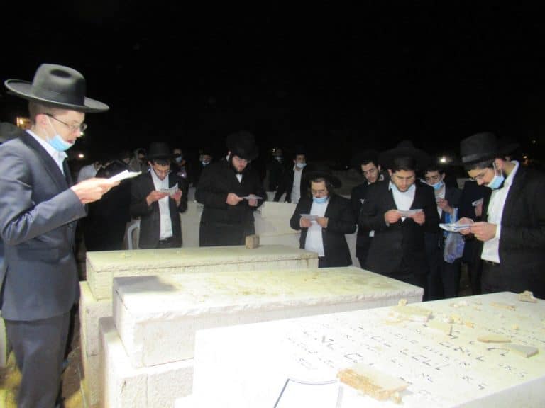 מעמד תפילה לרפואת משגיח ישיבת קרית מלך הגר"א פפויפר בקבר החזו"א בשעות המאוחרות של הלילה.