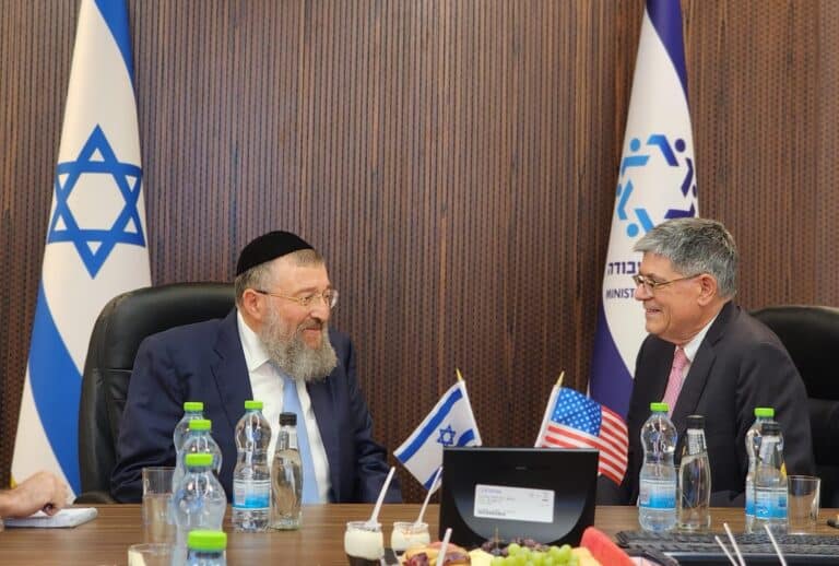 שר העבודה יואב בן צור נועד היום בלשכתו עם שגריר ארצות הברית בישראל ג׳ק לו • במהלך הפגישה השגריר בחן את ההשלכות הכלכליות של המשק בעקבות המלחמה וכניסתם של העובדים הפלסטינים לעבודה בישראל