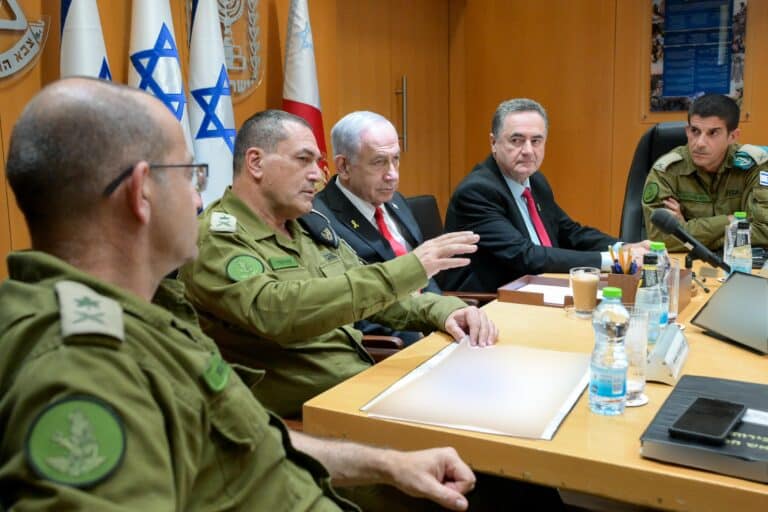 אחרי המתקפה: ראש הממשלה נתניהו נפגש עם פורום המטה הכללי של צה״ל בקריה בתל-אביב, יחד עם שר הביטחון ישראל כ״ץ והרמטכ״ל רב-אלוף אייל זמיר • נתניהו: "אני מודה לכם על הפעולה העצימה והמעולה שתירשם בדפי עמנו ובתולדות העולם"