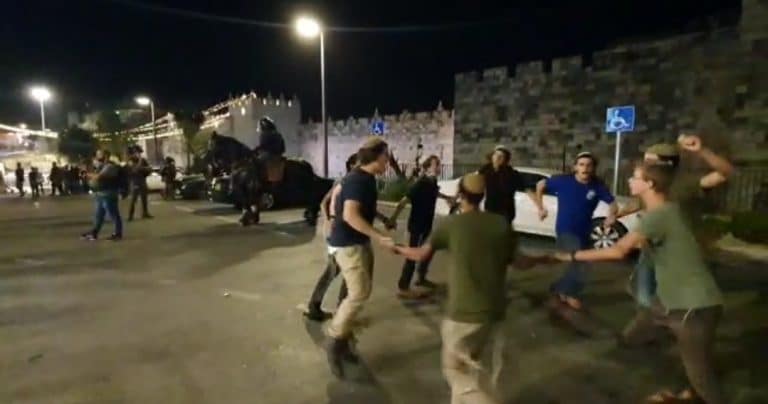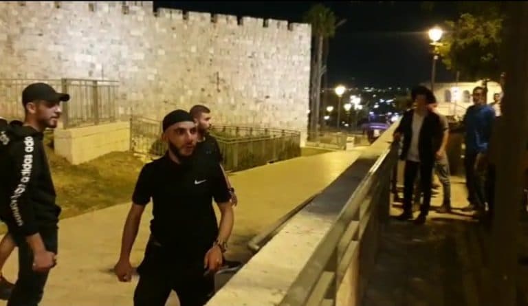 לילה שישי למהומות בירושלים: בתיעודים נראה צעירים ערבים משפריץ גז מדמיע לעבר נוער הגבעות שקראו קודם לכן "מוות לערבים" וכוחות משטרה שנמצאים במקום מנסים למנוע חיכוך בין הצדדים